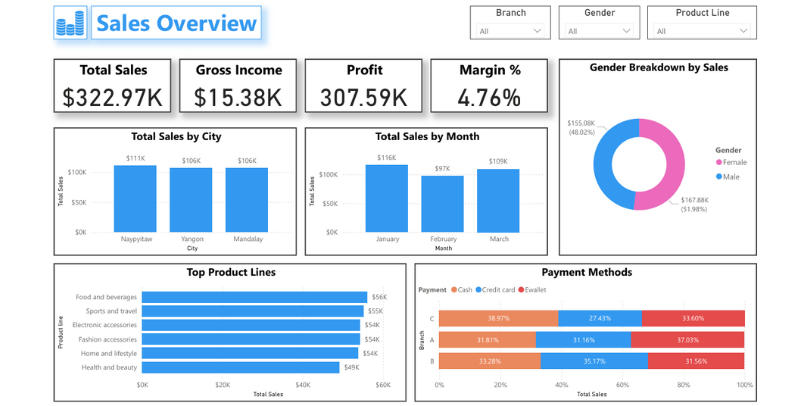 This report details the development of a Supermarket Sales Performance Dashboard using Power BI. The solution integrates static transactional data into a highly visual, interactive tool for business users. By leveraging DAX, Power Query, and advanced visuals, the dashboard provides deep insights into revenue drivers, customer behavior, and operational performance across all branches. The final deliverable supports data exploration, performance monitoring, and decision-making in real time. The solution helps executives and branch managers make smarter, faster decisions.
